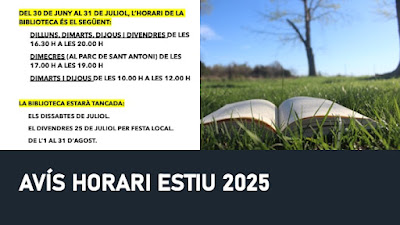 Del 30 de juny al 31 de juliol, modifiquem l'horari d'obertura habitual de la Biblioteca 👇